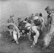 The 1st Battalion, London Irish Rifles formed part of the 1st London Infantry Brigade, itself part of the 1st London Division. In November 1940 the battalion transferred to the 2nd London Brigade, which was soon renumbered as the 168th (London) Infantry Brigade, due to the division's redesignation as the 56th (London) Infantry Division. From the outbreak of the Second World War in September 1939 until late July 1942, the battalion was in training, mainly in southeast England. The battalion left England in August 1942 to serve in the Middle East. In April 1943 the battalion, together with the rest of the 168th Brigade, was temporarily transferred to the 50th (Northumbrian) Infantry Division and fought in the Allied invasion of Sicily, codenamed Operation Husky, in July/August. The battalion, as part of the 168th Brigade, returned to the 56th Division in Italy in October, and took part in major actions during the Italian Campaign at Fosso Bottacetto south of Catania, Monte Camino, Monte Damiano, the Garagliano crossing during the first Battle of Monte Cassino and Aprilia (Anzio), and at the Gothic Line, and, transferring back to the 167th Brigade, the battalion played a leading role in the final Allied offensive in Northern Italy during April 1945.[12] In the month that they spent fighting in the Anzio beachhead, the 1st Battalion's casualties totalled 600 officers and other ranks killed, wounded and missing. Some 700 men of the London Irish Rifles were killed in action during the Second World War.[12]