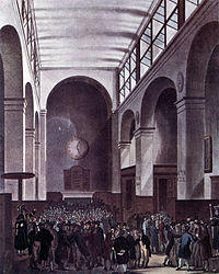 With its new governmental commandments[8] and increasing trading volume, the Exchange was progressively becoming an accepted part of the financial life in the City. In spite of continuous criticism from newspapers and the public, the government used the Exchange's organised market (and would most likely not have managed without it) to raise the enormous amount of money required for the wars against Napoleon.