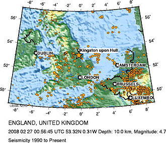 The map shows that there is some tendency for such seismic activity as there is in the region, to occur around the margin of the massif. It was into this pattern that the Dover Straits earthquake of 1580 and the 2008 Lincolnshire earthquake, the latter marked by an orange star, fell.
