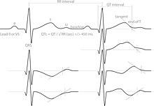 Long QT syndrome may be present at birth or develop later in life.[1] The inherited form may occur by itself or as part of larger genetic disorder.[1] Onset later in life may result from certain medications, low blood potassium, low blood calcium, or heart failure.[2] Medications that are implicated include certain antiarrhythmics, antibiotics, and antipsychotics.[2] LQTS can be diagnosed using an electrocardiogram (EKG) if a corrected QT interval of greater than 480–500 milliseconds is found, but clinical findings, other EKG features, and genetic testing may confirm the diagnosis with shorter QT intervals.[4][5]