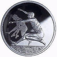 Track and field events have been selected as a main motif in numerous collectors' coins. One of the recent samples is the €10 Greek Long Jump commemorative coin, minted in 2003 to commemorate the 2004 Summer Olympics. The obverse of the coin portrays a modern athlete at the moment he is touching the ground, while the ancient athlete in the background is shown while starting off his jump, as he is seen on a black-figure vase of the 5th century BC.