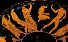 The long jump was considered one of the most difficult of the events held at the Games since a great deal of skill was required. Music was often played during the jump and Philostratus says that pipes at times would accompany the jump so as to provide a rhythm for the complex movements of the halteres by the athlete.[2] Philostratus is quoted as saying, "The rules regard jumping as the most difficult of the competitions, and they allow the jumper to be given advantages in rhythm by the use of the flute, and in weight by the use of the halter."[4] Most notable in the ancient sport was a man called Chionis, who in the 656 BC Olympics staged a jump of 7.05 metres (23 feet and 1.7 inches).[5]