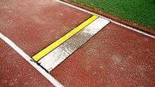 At the elite level, competitors run down a runway (usually coated with the same rubberized surface as running tracks, crumb rubber also vulcanized rubber—known generally as an all-weather track) and jump as far as they can from a wooden board 20 cm or 8 inches wide that is built flush with the runway into a pit filled with finely ground gravel or sand. If the competitor starts the leap with any part of the foot past the foul line, the jump is declared a foul and no distance is recorded. A layer of plasticine is placed immediately after the board to detect this occurrence. An official (similar to a referee) will also watch the jump and make the determination. The competitor can initiate the jump from any point behind the foul line; however, the distance measured will always be perpendicular to the foul line to the nearest break in the sand caused by any part of the body or uniform. Therefore, it is in the best interest of the competitor to get as close to the foul line as possible. Competitors are allowed to place two marks along the side of the runway in order to assist them to jump accurately. At a lesser meet and facilities, the plasticine will likely not exist, the runway might be a different surface or jumpers may initiate their jump from a painted or taped mark on the runway. At a smaller meet, the number of attempts might also be limited to four or three.