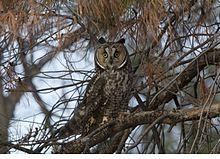 If seen well, an experienced observer is usually able to distinguish a long-eared owl by combination of its field marks, size and coloration. However, some potential owl species may be confused for them. Stygian owls (Asio stygius) (which barely overlap perhaps in northern Mexico) is larger with partially bare toes and generally darker with inky and more boldly patterned plumage, with often nearly the enter facial mask appearing off-black.[7][36] Tawny owls, which co-exist with long-eared owls in Eurasia, are unlikely to be mistaken given that they usually appear considerably rounder and bulkier overall (and are indeed slightly larger and much heavier), further possessing a much broader, more rounded head. The tawny species has no ear tufts, eyes of blackish-brown colour and relatively shorter wings. In flight, tawny owls show well-fingered primaries (with five apparent emarginations) unlike the squared off wings of the long-eared owl.[7][20][37] The Eurasian eagle-owl (Bubo bubo) is far larger and more massive than a long-eared owl with visibly more overdeveloped and powerful-looking feet and talons and a huge squared-off-looking head with the ear tufts set nearer to the edge. The eagle-owl is often more heavily patterned on the crown and back with heavy blackish marking but has a less strongly demarked (and shallower) facial disc when compared to the long-eared.[7][20] In some parts of the wintering range, other eagle-owls may scarcely abut the wide range of long-eared owls in Eurasia (and perhaps Northwestern Africa) but are usually distinguishable (similarly as in the Eurasian species) by size differences, plumage characteristics and, occasionally, habitat preferences.[5] Asian fish owls, which are essentially a subset of eagle-owls, are generally also much larger than long-eared owls with tousled looking ear tufts, have less variable coloring and often have feathering over only part of their tarsi.[7] In North America, great horned owls (Bubo virginianus), yet another type of eagle-owl in all but name, have a squarish head and more widely separated ear tufts. Like other Bubo species, great horned owls are also perceptibly larger and more massively built than any long-eared owl (despite being smaller than the Eurasian eagle-owl). Great horned owls also have typically heavily barred, rather than streaked, underparts.[7][8] Scops and screech owls are much smaller than long-eared owls, as well as differently marked (often with more individual varying overall coloring, i.e. from gray to brown to rufous) and usually have rather short ear tufts.[7] Marsh owl (Asio capensis) (rare overlap perhaps in northern Morocco) is generally brown with quite different looking fine mottling or barring below and has brown eyes and tiny ear tufts.[7]