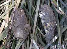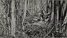 Normally nests in stick nest of large birds, i.e. Corvus, Pica, raptors and Ardea herons. Other nest builders in Europe can often include common wood pigeons and Eurasian sparrowhawks.[7][19] In Britain and Finland 84% of 239 and 85 nest were made by carrion (Corvus corone) or hooded crows (Corvus cornix) and Eurasian magpies. In England and Finland, 77% and 66% of the nest were in conifers, respectively.[13][20] In Brandenburg, Germany, 90% of the nest were built by carrion crows and most were in Pinus sylvestris.[245] In different studies of Idaho, nearly all known nests were in old corvid nests (most being in juniper). In one large study, nest heights, which averaged 3.2 m (10 ft), and diameter of the nest construction, which averaged 22.3 cm (8.8 in), were deemed likely to be the most significant criteria for nest selection.[12][163][244] In Ontario, conifers were usually used, often Pinus or Juniperus, in corvid nests between 2.5 and 18.5 m (8.2 and 60.7 ft) high, but mostly between 5.5 and 9 m (18 and 30 ft).[79] Nest height averaged 6.7 m (22 ft) in Great Britain.[13] In Slovenia, long-eared owls preferred coniferous trees for breeding (in almost exclusively corvid nests), those that nested in deciduous trees had higher nest mortality especially earlier in the season due to higher predation rates.[237] Similarly, nest site selection was largely correlated to predation risk in Spain, with ivy and tree canopy coverage less important than high scrub cover from below, in part because terrestrial predators were more common in the particular study area than aerial ones.[248] In northeast Switzerland, nesting location are selected for anti-predator features, among 38 nesting sites, the ones seemingly preferred bore denser forest edges, greater canopy cover and were within conifers much more so than were prevalent in the overall environment, while the vicinities of buildings were avoided in the study area.[209] An unusual case of urban breeding long-eared owls was observed in Moscow, Russia, where a loose colony was observed to form. The Moscow nesting was thought to be the result of synanthropization by the owls, in part due to lower predation risk in the urban areas versus rural vicinities (where predation was 6.6% higher). The mean distance of nesting owls in Moscow was 603 m (1,978 ft) whereas it was more than twice the distance in nearby rural areas.[249] Tree nests are usually under 30 m (98 ft) above the ground, and can sometimes be so small that the wings and tail of brooding female may be visible from below.[19] More infrequently than avian tree nests, leaf nests of tree squirrels, hawk nests in catci and cliff nests of various birds may be used.[12][13][28][250] While they usually take up already abandoned nest sites, sometimes long-eared owls are capable of chasing off prior occupant of nest even including other raptors (extending to fierce Accipiters such as sparrowhawks, sharp-shinned hawks and even larger Cooper's hawks) indicative of their potential for fierceness and tenacity.[3] Other than other bird's nests, alternate nesting sites have been used but appear to be usually rare or uncommon. Among these, are shallow depressions on the ground.[7][28][81] Some ground nest locations recorded (in Europe) have included among heather, bracken and bramble, and even on reed beds, rabbit warrens. Some nests have been recorded in wicker baskets placed in trees for ducks.[3][13][251][252][253] In North America, pairs of ground nest were found in each west-central Montana and in Okavagan, British Columbia, in all cases between the roots of or the ground immediate adjacent to the base of trees or bushes (with two other historic records of ground nesting in North America).[171][254] Artificial nesting platforms made of twigs for the owls are also locally accepted. In Woodwalton Fen reserve of eastern England, 71 nests were built in wicker baskets set out for owls.[255] Also in Yizre'el in Israel, 6 of 16 nest baskets hung in Eucalyptus were used by long-eared owls, with all occupied by February. In this general area of Israel, at least 72 other nest baskets for long-eared owls have been set out, to encourage the rodent controlling birds.[256] Exceptionally, long-eared owls have nested in shallow cavities, in hollow willows or oaks, tree stumps or holes in cliffsides, however as a rule they tend to not be cavity nesters.[3][257] 6.5% of 153 nests in Great Britain were on natural surfaces (mostly the ground) rather than animal nests.[13] Nesting vicinities where previous attempts were successful are more likely to be reused, i.e. in Idaho where 48% of prior nesting areas were reused after successful attempts.[8][12]