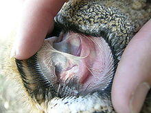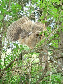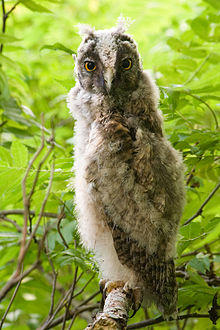 The young hatch at 2 day intervals at any point between very late April and June.[3][170] The average weight of 52 hatchlings in Montana was 18.4 g (0.65 oz).[261] Their eyes open at 5–7 days (averaging 6.4 days in Montana) and they are brooded by the mother for about 2 weeks, often while the male perches nearby and watches over. The female alone feeds the chicks. In Idaho, the male was recorded to 2.5 times more prey deliveries during nesting than did the female.[7][95][261] Injury feigning displays have been recorded at the nestling stage as an anti-predation measure.[7][8][48] Usually long-eared owls are less bold in nest defense than some other owls, Strix owls for example, but they are capable of fierce protective attack nonetheless. Nesting defense by parents increased in Italy further into breeding season, with older nestlings being defended more vigorously. Females do a majority of nest defenses. Owl pairs incurring higher levels of regular disturbance are more likely to have a milder nest defense.[3][95] During a defensive display, the parent ruffles up their plumage and partially spreads the wings to half open, trampling from one foot to the other, hissing and bill snapping and can look surprisingly large in this posture. If a perceived threat continues towards the owls, they may leap up and try to rake and grab at the threat with their talons. Even animals as large as humans may find themselves the victim of long-eared owl defensive attacks if they approach or, especially, if they climb up to a nest.[8][19] The young leave the nest at 20–27 days of age (average about 22 days) but are initially flightless, often climbing about surrounding branches. At this stage they may be referred to as "branchers".[7][260][261] Quite often the young fall to the ground, but they are usually able to climb back up using their claws and bill with heavy wing flapping. At dusk the begging branchers call to their parents with high pitched notes to indicate their location. At about 35–37 days, they are fully fledged and can fly well, but they often follow their parents and are fed by them for up to about 2 months, continuing to make high pitched calls.[7][8][261] In Slovenia, independence was gained about 50–80 days after hatching, while in Idaho it was about 45 to 56 days.[95][264]