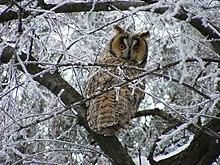 In North America, the range of predators of long-eared owls is no less daunting. Undoubtedly the most dangerous American predator is the great horned owl. Similarly as in its European eagle-owl counterpart, horned owls kill long-eared owls regardless of season and conditions. However, despite many accounts of predation, long-eared owls do not generally seem to be as prominent in the diet of great horned owls, at least as so far documented, as they are in the diet of Eurasian eagle-owls. Barred owls can also be somewhat serious predators of long-eared owls as well.[81][155][171][231] Rarer acts of predation on long-eared owls in North America have reportedly been committed by spotted owls (Strix occidentalis) and even their cousins, the short-eared owl.[3][232] Diurnal predators of long-eared owls including some species that also hunt them in Europe such as golden eagles, northern goshawks and peregrine falcons, as well as bald eagle (Haliaeetus leucocephalus), Cooper's hawk (Accipiter cooperii), red-tailed hawk (Buteo jamaicensis) and red-shouldered hawk (Buteo lineatus).[12][28][171][233][234][235][236] Though less well documented throughout the range, long-eared owls are also vulnerable to mammalian predators, mainly near the nest. Suspected or confirmed predators in Europe are often European pine martens or stone martens (Martes foina), which are likely to depredate nestlings but also will consume eggs and adults if they are able to ambush them.[209][237][238] Martens are also a potential threat in North America, as are the North American porcupine (Erethizon dorsatum), bullsnake (Pituophis catenifer) and, especially, the raccoon (Procyon lotor) (the latter species may semi-regularly kill and eat brooding adult female long-eared owls).[12][28][171][236][239][240] Corvids, many of which build the nests long-eared owls use, such as magpies and crows will also semi-regularly raid the long-eared owl's nests and eat the eggs or nestlings.[12][20][28][237] On the other side of the equation, long-eared owls themselves may infrequently prey on smaller owls. This species has been known to hunt eastern screech owls, little owls, Eurasian pygmy owls (Glaucidium passerinum) and boreal owls (Aegolius funereus), as well as the young of the common kestrel.[3][12][75][81][186]