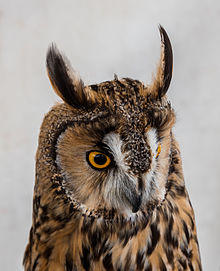 This species is a rather slim and long winged owl with usually prominent erectile ear tufts, which are positioned closer to the center of the head than in many other types of owl. The purposes of ear tufts are not definitively known and are present in about half of living owls.[3] Arguably the most popular theory amongst biologists and ornithologists is that ear tufts could be a means of intraspecies communication of intent and mood.[18] In general coloration, the long-eared owl is often considered a hue of ochraceous-tawny with a grayish or brownish wash variably manifesting. The base color is commonly overlaid with variable blackish vertical streaks (and occasionally spots), which are usually more apparent about the wings and back. The scapulars are usually marked whitish, which provide further contrast when seen against the base color and blackish markings. The wing's dark carpal patches can also display broad panels of buff or almost orange on the wings across the base of primaries, which represent a more richly emphasized version of a pattern shared with other owls that tend to be vole-hunting specialists, like short-eared owls (Asio flammeus) and great gray owl (Strix nebulosa). On the underside, the body tends to be a somewhat paler ochraceous-tawny compared to the upperside. Long-eared owls tend to have dusky streaks on the upper breast, below which they may be heavily marked with herring bone pattern (which is created by dusky shaft-streaks and crossbars on these feathers).[2][3][7][8][19] There is much individual and regional variation in markings with owls dwelling in more extensively forested regions tending to be of a darker hue, often so densely washed above as to appear largely dusky brown on the back and the underside largely overlaid with bolder dusky-blackish marks. Meanwhile, in some desert-like regions, the plumage may tend towards a somewhat more washed out look, at times appearing fairly cream or yellowish, with sparser and lighter dusky markings overall.[3][20] The facial disc is visibly well developed and variably colored (see subspecies) in the species, rimmed dusky often with white running down along the center through the bill, while at times the white lines form a “moustache” and/or extending to the inside of the facial disc rim. The ear tufts are usually dusky in front and paler tawny on the back. Long-eared owl possess a blackish bill color while its eyes may vary from yellowish-orange to orange-red, tarsi and toes feathered.[3][7][19]