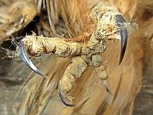 Long-eared owls may divide their hunting into phases, the first stopping around midnight, the second beginning some point after midnight and ending an hour before sunrise.[3][7] While hunting, they tend focuses on the edge of woodlands, hedgerows and open spaces with rough grassland, and over young trees and open ground of all kinds. They hunt mainly on the wing, flying low and fairly slowly, often being quite low to ground, i.e. only around 150 cm (59 in).[3][7][19] More often than visually finding their prey, it is thought that long-eared owls most often audibly detect the rustling of their intended food. In lab settings, long-eared owls were considerably more skilled at finding mice by sound in more or less complete darkness than tawny and barred owls (Strix varia), and in some American experiments even outclassed the auditorily-acute barn owls in this regard.[104][105] Once prey is spotted, the long-eared owl's flight suddenly stalls, then they quickly drop with talons spread to pounce on prey that is perceived, or especially, that comes out into the open.[3][7] Habitat may be perhaps even more key than prey numbers to the selection of hunting grounds. Often when prey numbers are more ample in timbered areas nearer the roost or rich marshy areas in the vicinity, the long-eared owls will still often come to more prey-poor areas such as old fields so that they can detect prey on open ground.[76][106] The footspan of a long-eared owl, including claws, reaches on average 11.3 and 12.5 cm (4.4 and 4.9 in) in males and females, respectively, which would be large for a diurnal bird of prey but is quite small for an owl of its size, given the physiological differences in the way different birds of prey tend to kill their prey. While acciptrid raptors tend to kill by stabbing with their talons through vital organs, owls are more likely to constrict their prey to death, so tend to have proportionately larger, more robust feet.[3][104][107][108] In other medium-sized owls, the footspan in tawny owls and barn owls respectively averages 13.4 and 13.2 cm (5.3 and 5.2 in) in between the sexes (notably footspan seems to be a fairly reliable predictor of body mass of an owl as well).[3][104] Prey capture by long-eared owls was studied and compared to tawny owls in a European experiment. The two owl species caught mammals and beetles caught in similar ways but the long-eared owls shied away from flying sparrows and would only capture the sparrows when they perched (though the tawny did not avoid flying sparrows, it too would only capture the prey when perched). Long-eared owls either disregarded or killed but did not eat amphibians, while tawny owls did catch and eat amphibians when they were available. Occasionally the tawny owls would attack fish whilst one long-eared owl caught but did not eat a fish. The European study further revealed that several owls of different species ate bits of plant and did not appear to do so out of food deprivation or hunger.[109]
