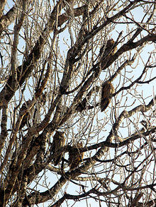 During daytime, long-eared owls tends to roost in an upright position on a branch, not infrequently close to the trunk, oftentimes within dense foliage. In winter often stays close to the same tree or grove of trees (i.e. in parks, large gardens, or cemeteries). Usual when approached, the owl will freezes with its body stiffly upright, eyes closed to narrow slits and ear tufts erect. This is called the “tall-thin position” and is common to at least a couple dozen species of typical owl. If approached closed, the owls will alternately open and close their eyes (apparently having stirred but trying to fool potential predators into thinking the owl is still at rest), finally lowering ear tufts, fluffing body plumage and flying to another roost.[7][20] Unlike most owls, which show a tendency towards territorial behavior on a fixed range year-around when possible, long-eared owls in the non-breeding season are often prone to occur in aggregations of owls while roosting. Such grouping may not uncommonly include up to 6 to 50 owls at times, with a European record of about 150 owls at a single roost.[3][19][20][81] Even other migratory owls in the temperate zone do not tolerate each other as closely as do long-eared owls, with short-eared owls seemingly only forming aggregations when food supplies are exceptionally high, while social roosting in long-eared owls seems to occur regardless of local prey numbers.[20][101] Long-eared owls tend to roost in the depths of the "darkest stands of trees" in order to conceal their presence, though they prefer being close to forested edge to allow access to hunting over more open ground.[19] A study in the New Jersey Meadowlands area showed that roosting owls had a strong fidelity for certain trees, particularly conifers such as cedars where the main truck is large obscured from view and a grouping of at least 2-3 closely clumped trees occurs. Roost height in the New Jersey study was at 3 to 15 m (9.8 to 49.2 ft) or occasionally higher. In New Jersey, different roosts were preferred each year and in the local heavily modified environment, the owls become partially habituated to human activities. However, approach at closer than 3 to 4 m (9.8 to 13.1 ft) away usually caused them to flush. Departure of owls for nighttime hunting would generally occur between 40 and 49 minutes after sundown.[16] Studies in the Moscow region of wintering roosts were done over 10 years, with 12 communal and 14 solitary roosts found. The communal roosts included up to 16 individuals per winter, with a mean of 9.9. Overall, the average in Moscow per roost site was 2.1 owl(s). Vole numbers the preceding year were likely the causes of numeric variations in years here while wind and snow avoidance were key in characteristics of roost sites.[102] Extraordinarily large roosts were the norm in a study in Stavropol, Russia, where the general roost area could host from 80 to 150 individuals each winter over 4 years, with 93.7% of the roosts located in coniferous trees.[103] In Milan, Italy, from 2 to 76 long-eared owls were observed per urban roost site. Here, nighttime observation showed that owls individually would depart the roost at peak during the darkest part of nighttime. A majority of the Milan roosting owls did not fly toward urban areas instead flying to suburban fields and forest where prey is more easily encountered.[15] The reason for roosting in aggregations seems to be at least in part to mitigate predation risks.[3][16]