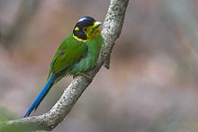 Adult long-tailed broadbills have a bright yellow throat and face, where the yellow patch ranges on each side of the occiput.[3] The yellow feathers continue down to a form a thin band around the neck. There is a thin layer of pale-yellow/whitish feathers that envelops the yellow patch below their throat. Some even have a hint of pale yellow-green on their chin.[4] They have a helmet-like black cap with a sleek blue patch on the crown and a smaller blue patch at the back of their neck.[4] The feathers along the back, belly and top of the wings are bright green produced by a combination of pigmentary and structural color.[5] The underparts of the wings are a lighter green or blueish green. The primary feathers are black, with a metallic blue margin at the base of the external web and a white spot on the base of the inner web.[4]