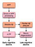 In a 2003 review of the literature, Rowan et al. proposed one model for how LTP might be affected in AD.[62] AD appears to result, at least in part, from misprocessing of amyloid precursor protein (APP). The result of this abnormal processing is the accumulation of fragments of this protein, called amyloid β (Aβ). Aβ exists in both soluble and fibrillar forms. Misprocessing of APP results in the accumulation of soluble Aβ that, according to Rowan's hypothesis, impairs hippocampal LTP and may lead to the cognitive decline seen early in AD.
