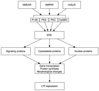 Late LTP is induced by changes in gene expression and protein synthesis brought about by the persistent activation of protein kinases activated during E-LTP, such as MAPK.[31][32][37] In fact, MAPK—specifically the extracellular signal-regulated kinase (ERK) subfamily of MAPKs—may be the molecular link between E-LTP and L-LTP, since many signaling cascades involved in E-LTP, including CaMKII and PKC, can converge on ERK.[37] Recent research has shown that the induction of L-LTP can depend on coincident molecular events, namely PKA activation and calcium influx, that converge on CRTC1 (TORC1), a potent transcriptional coactivator for cAMP response element binding protein (CREB).[38] This requirement for a molecular coincidence accounts perfectly for the associative nature of LTP, and, presumably, for that of learning.