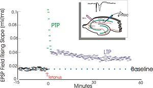 - ^ a b Bliss TV, Gardner-Medwin AR (July 1973). "Long-lasting potentiation of synaptic transmission in the dentate area of the unanaestetized rabbit following stimulation of the perforant path". The Journal of Physiology. 232 (2): 357–74. doi:10.1113/jphysiol.1973.sp010274. PMC 1350459. PMID 4727085.