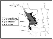 - The 'eastern' subspecies (A. m. krausei) range is distributed throughout the interior mountains, with the western extent of its range encroaching into the low-land areas of the central interior plateau of Washington and British Columbia and the eastern extent of its range pushing through Rocky Mountain valleys into the lowland foothills and prairies of Montana and Alberta.[18][80]