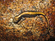 The long-toed salamander (Ambystoma macrodactylum) is a mole salamander in the family Ambystomatidae.[2] This species, typically 4.1–8.9 cm (1.6–3.5 in) long when mature, is characterized by its mottled black, brown, and yellow pigmentation, and its long outer fourth toe on the hind limbs. Analysis of fossil records, genetics, and biogeography suggest A. macrodactylum and A. laterale are descended from a common ancestor that gained access to the western Cordillera with the loss of the mid-continental seaway toward the Paleocene.