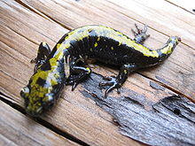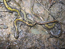 In some lowland areas the adult salamanders will remain active all winter long, excluding cold spells. However, during the cold winter months in the northern parts of its range, the long-toed salamander burrows below the frost-line in a coarse substrate to hibernate in clusters of 8–14 individuals.[27][49] While hibernating, it survives on protein energy reserves that are stored in its skin and along its tail.[50] These proteins serve a secondary function as part of a mixture or concoction of skin secretions that is used for defense.[51] When threatened, the long-toed salamander will wave its tail and secrete an adhesive white milky substance that is noxious and likely poisonous.[43][52] The color of its skin can serve as a warning to predators (aposematism) that it will taste bad.[51] Its skin colors and patterns are diverse, ranging from a dark black to reddish brown background that is spotted or blotched by a pale-reddish-brown, pale-green, to a bright yellow stripe.[23][26] An adult may also drop part of its tail and slink away while the tail bit acts as a squirmy decoy; this is called autotomy.[53] The regeneration and regrowth of the tail is one example of the developmental physiology of amphibians that is of great interest to the medical profession.[54]