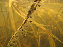 Like all amphibians, the life of a long-toed salamander begins as an egg. In the northern extent of its range, the eggs are laid in lumpy masses along grass, sticks, rocks, or the mucky substrate of a calm pond.[26] The number of eggs in a single mass ranges in size, possibly up to 110 eggs per cluster.[27] Females invest a significant amount of resources into egg production, with the ovaries accounting for over 50% of the body mass in the pre-breeding season. A maximum of 264 eggs have been found in a single female—a large number considering each egg is approximately 0.5 millimeters (0.02 in) in diameter.[28] The egg mass is held together by a gelatinous outer layer protecting the outer capsule of individual eggs.[29] The eggs are sometimes laid singly, especially in warmer climates south of the Canada and US border. The egg jellies contribute a yearly supply of biological material that supports the chemistry and nutrient dynamics of shallow-water aquatic ecosystems and adjacent forest ecosystems.[30] The eggs also provide habitat for water molds, also known as oomycetes.[31]