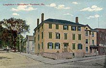 Longfellow was born on February 27, 1807, to Stephen Longfellow and Zilpah (Wadsworth) Longfellow in Portland, Maine,[1] then a district of Massachusetts.[2] He grew up in what is now known as the Wadsworth-Longfellow House. His father was a lawyer, and his maternal grandfather was Peleg Wadsworth, a general in the American Revolutionary War and a Member of Congress.[3] His mother was descended from Richard Warren, a passenger on the Mayflower.[4] He was named after his mother's brother Henry Wadsworth, a Navy lieutenant who had died three years earlier at the Battle of Tripoli.[5] He was the second of eight children.[6]
