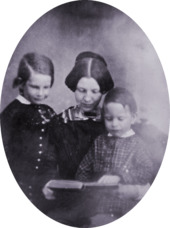 He and Fanny had six children: Charles Appleton (1844–1893), Ernest Wadsworth (1845–1921), Fanny (1847–1848), Alice Mary (1850–1928), Edith (1853–1915), and Anne Allegra (1855–1934). Their second-youngest daughter was Edith who married Richard Henry Dana III, son of Richard Henry Dana, Jr. who wrote Two Years Before the Mast.[65] Their daughter Fanny was born on April 7, 1847, and Dr. Nathan Cooley Keep administered ether to the mother as the first obstetric anesthetic in the United States.[66] Longfellow published his epic poem Evangeline for the first time a few months later on November 1, 1847.[66] His literary income was increasing considerably; in 1840, he had made $219 from his work, but 1850 brought him $1,900.[67]
