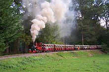 Established in 1965 and expanded in 1976, this 15 in (381 mm) gauge ridable miniature railway is among the busiest in the country. It has a length of one and a quarter miles (2 km) through scenic woodland and along the edge of Half Mile Lake. The line has taken several different courses across the years, but the route along the lake has remained consistent. After opening the railway was originally run by outside company Minirail on a ten-year contract, which was not renewed due to disagreements between the two companies. Following this, Longleat took over running the railway in 1976. Many engines have run on the railway over the years, both steam and diesel; as of 2018 the railway owns three diesel locomotives. The railway also has 15 carriages, all built at Longleat between 1976 and 2013 and wearing mock British Railways crimson and cream livery, along with several permanent way wagons. Between 2011 and 2017 the railway was known as the Jungle Express, with the station and carriages given additional theming.[15][16][17]