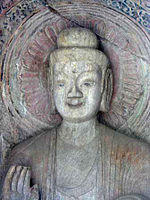 Binyangzhongdong (Chinese: 宾阳中洞) or the Middle Binyang Cave, is carved in the Datang style on the west hill, on the northern floor. It was built by Emperor Xuanwun to commemorate his father Xiaowen, and also his mother. It is said that 800,000 workers created it over the period from 500 to 523. In the main wall of this cave, five very large Buddhist statues are carved all in Northern Wei style The central statue is of Sakyamuni Buddha with four images of Bodhisattvas flanking it. Two side walls also have Buddha images flanked by Bodhisattva. The Buddhas, arranged in three groups in the cave, are representative of Buddhas of the past, the present, and the future. The canopy in the roof is designed as a lotus flower. There were two large bas-reliefs of imperial processions, that included Emperor Xiaowen, Empress Dowager Wenzhao, and the emperor's late parents in worship. The reliefs were stolen completely in the mid-1930s. The emperor's procession is now in the Metropolitan Museum of Art in New York and two thirds of the empress's is in the Nelson-Atkins Museum of Art in Kansas City. While a few statues are sculpted with "long features, thin faces, fishtail robes and traces of Greek influence", others are in Tang period natural style and heavily built.[3][5]