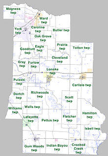Townships in Arkansas are the divisions of a county. Each township includes unincorporated areas; some may have incorporated cities or towns within part of their boundaries. Arkansas townships have limited purposes in modern times. However, the United States Census does list Arkansas population based on townships (sometimes referred to as "county subdivisions" or "minor civil divisions"). Townships are also of value for historical purposes in terms of genealogical research. Each town or city is within one or more townships in an Arkansas county based on census maps and publications. The townships of Lonoke County are listed below; listed in parentheses are the cities, towns, and/or census-designated places that are fully or partially inside the township. [12][13]