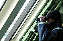 A lookout or look-out is a person in charge of the observation of hazards. The term originally comes from a naval background, where lookouts would watch for other ships, land, and various dangers. The term has now passed into wider parlance.