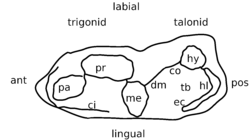 Some Jurassic mammals, such as Shuotherium and Pseudotribos, have "reversed tribosphenic" molars, in which the talonid is towards the front. This variant is regarded as an example of convergent evolution.[6]