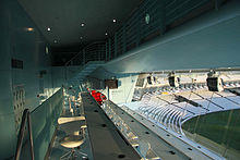 It was built and fitted-out in two boatyards and utilises boat-building technology. It has only one opening window, which is in the broadcasting box occupied by BBC Test Match Special.[3]