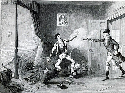 FitzGerald's hiding place was disclosed by a Catholic barrister and informer named Francis Magan and on 18 May Major Henry Sirr led a military party to the house where Lord Edward was in bed suffering from a fever. Alerted by the commotion, FitzGerald jumped out of bed and, ignoring the pleas of the arresting officers Captain William Bellingham Swan (later assistant town Major of Dublin) and Captain Daniel Frederick Ryan to surrender peacefully, FitzGerald stabbed Swan and mortally wounded Ryan with a dagger in a desperate attempt to escape.[7] He was secured only after Major Sirr shot him in the shoulder.[7]