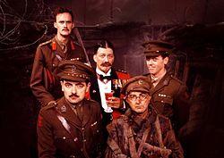 Main characters from Blackadder Goes Forth: Darling (left), Melchett (centre), George Colthurst (right), Baldrick (bottom right), Blackadder (bottom left)