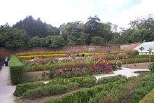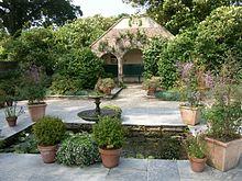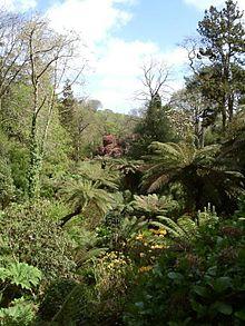 The northern part of the gardens, which includes the main ornamental and vegetable gardens, are slightly higher than the house and slope gently down to it. The areas of the gardens to the west, south, and east of the house slope steeply down into a series of valleys that ultimately drain into the sea at Mevagissey. These areas are much wilder and include the Jungle and the Lost Valley.[2]
