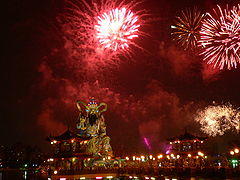 It was established in 1953, were two Chinese palace-style pavilions. Spring and Autumn Pavilions named from the Spring Pavilion and Autumn Pavilion. Each of these two is four stores and octagonal, green tiles and yellow walls, like an antique pagoda reflected in the water. And they communicate with each other by 9 bend bridge, also called ‘Spring and autumn Royal Pavilion’, set up by commemorated ‘The Martial Saint, Lord Kua’. There is a Guanyin statue which is riding a dragon in the front end of the Spring and Autumn Pavilions. According to local legend, the Goddess of Mercy had rode the dragon appeared in the clouds and instruct followers to build icon as the form of its coming out between the Spring Pavilion and Autumn Pavilion; Therefore, now there is a Guanyin statue which is riding a dragon.