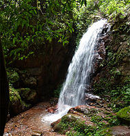 The Nam Ha National Biodiversity Conservation Area (NBCA) has dense forest covering 90% of the area.[3] May to September are the rainy months with average annual rainfall of 1,256 millimetres (49.4 in).[8] December to February are the winter months with temperatures touching as low as 5 °C (41 °F). Heavy fog is common in the morning with warm and sunny middays. The average annual temperature is 25.75 °C (78.35 °F). Vegetation zones in its plains are between 540–1,000 metres (1,770–3,280 ft) elevation, consisting of bamboo, secondary evergreen forest and scrub (introduced by humans). In the Northern Highlands zone, between elevations of 1,000–2,094 metres (3,281–6,870 ft), primary evergreen forest is mixed with secondary forest as well as large patches of Imperata grass. In the Southern Highlands, which range between 1,000–1,572 metres (3,281–5,157 ft) elevations, there is evergreen forest and scrub. Secondary evergreen forests and scrub are found in the Nam Kong area bordering the Chinese border, lying between elevations 600–1,556 metres (1,969–5,105 ft).[9] Wildlife reported from the NBCA are wild cattle such as guar and banteng, Asian wild dogs, tigers, clouded leopard, bears, monkeys and gibbons and also muntjac.[3] The conservation area was initially established covering an area of 677 square kilometres (261 sq mi) in 1991 which was subsequently enlarged to an area 2,244 square kilometres (866 sq mi) (entirely within the province) which borders with Shiang Yong Protected Area in Yunnan Province in China. There are 33 large mammals (of which 22 are key species), including Malayan sun bear and black cheeked crested gibbons, and 288 species of birds (of which 18 are key species). It has been designated as an Asian Heritage Site. One issue of concern is of rubber cultivation in large areas.[9][10]