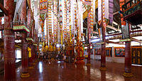 There are some 20 temples in Muang Sing. Of note is Wat Sing Jai or Wat Xieng Jai, behind the Muangsing Guest House. The monastery, painted in hues reminiscent of the Caribbean, has a museum, but because its items are of high local value, it is closed to visitors for fear of theft.[20] Another major temple is Wat Namkeo. The wihan in the town are typically multi-tiered, roofed buildings typical of northern Laos, but most houses have corrugated metal roofs and wooden beams, reflecting the poverty of the area. The Buddhas, however, are golden, and typically have large long earlobes, commonly seen in Xishuangbanna, China, and the Shan State of Burma.