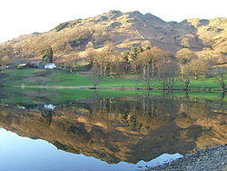 Alfred Wainwright notes that Loughrigg Tarn is "one of the most secluded of tarns", rarely being visible from the fells.[2] He also identifies that Loughrigg Fell is the only Lake District fell to share its name with a tarn, although he might have overlooked Scoat Fell (Scoat Tarn) and Bowscale Fell (Bowscale Tarn).[3]