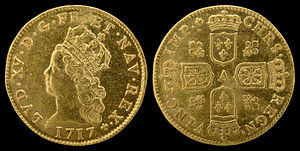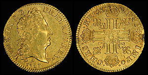 Under Louis XV, mintage of the Louis d’or was at first reduced while John Law introduced paper money. After Law's system failed and Cardinal Fleury became Louis XV's chief magistrate in 1726, France returned to a policy of sound money and the mintage of the Louis d’or returned to normal levels. The weight of the Louis d’or was now increased to 8.1580 g and gold content of 0.2405 troy oz, it was revalued at 20 livres, and a commitment was made to maintain this valuation. This promise was kept until 1740 when the louis d’or was revalued to 24 livres, thereby effecting a 20% devaluation of the livre. This was the last devaluation until the French revolution replaced the louis d’or by the franc.[10]