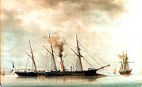 On 21 July, the two frigates encountered a British convoy off the coast of New Scotland. In the resulting naval battle of Louisbourg, Astrée and Hermione forced HMS Charlestown to strike her colours, but failed to board her, allowing her to flee during the night.[1][18] They did however capture the 14-gun escort, Jack, and three merchantmen, which they brought to Boston.[18]