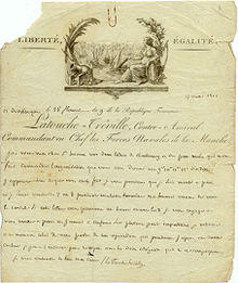 In 1799, Latouche was appointed to lead a naval division in Brest, with his mark on the 74-gun Mont-Blanc.[26] Soon after, he was appointed to command the full Brest fleet,[26] and transferred his flag onto the 110-gun Terrible.[26] Latouche-Tréville defended the harbour until the government decided to disband the naval Army of Brest; Latouche-Tréville then sailed four of its ships to Rochefort.[2]