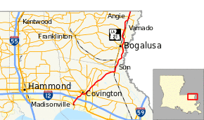 Through most of Covington, LA 21 is in a mostly two-lane undivided highway concurrent with US 190 Bus., which returns to US 190 on the east side of Covington—an area known as Claiborne Hill. After intersecting US 190 and before leaving Covington cosigned as Military Road, LA 21 absorbs LA 36 and continues northeastward, absorbing LA 59 and entering a brief concurrency with Louisiana Highway 40 in Bush for less than one mile (1.6 km). Between Bush and Sun, LA 21 widens to a four lane, divided highway after merging Louisiana Highway 41, continuing due north from the merge. In Sun LA 21 absorbs LA 16 and continues northward to Bogalusa, where LA 21 intersects LA 10. LA 21 then runs north through Varnado and Angie before becoming Mississippi Highway 35 at the state line.[1]