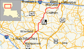 The route connects Monroe, the principal city of northeastern Louisiana and the seat of Ouachita Parish, with Winnfield, a smaller city that serves as the seat of Winn Parish. Winnfield is located at the junction of US 84 and US 167, which run concurrent with LA 34 through the center of town. Near its northeastern terminus in West Monroe, LA 34 has an interchange with Interstate 20 (I-20).