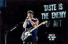 "Love Is Blindness" debuted on 29 February 1992 in Lakeland, Florida, on the opening night of the Zoo TV Tour, where it closed the concert.[25] It remained in this position throughout the first and second leg of the tour, with only two concerts concluding with an alternate song – "With or Without You". "Love Is Blindness" was not performed on either of those two occasions.[26] Beginning on the third leg of the tour it was followed by a cover of the Elvis Presley song "Can't Help Falling in Love" and, on one occasion, "Are You Lonesome Tonight?".[27] The song was performed at 154 of 157 concerts on the tour, closing 67 of them.[28] On multiple occasions Bono brought a girl from the audience on to the stage to dance with during the song.[25][29] Following the conclusion of the Zoo TV Tour, "Love Is Blindness" has appeared in concert only twice. The first occasion was on the Elevation Tour; while performing in Calgary, Alberta, on 10 April 2001, Bono sang a few lines from the song at the conclusion of "One".[30] The final appearance was during a Vertigo Tour concert in Buenos Aires, Argentina, on 1 March 2006, when U2 performed the song spontaneously to conclude the concert.[31][32]