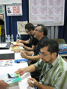 The brothers Gilbert, Jaime, and Mario Hernandez self-published the first issue of Love and Rockets in 1981. In 1982, Fantagraphics Books republished this issue with a color cover. The series was published at magazine size, larger than typical American comic books. Either Gilbert or Jaime, the series' main contributors, would provide the front cover for a given issue, and the other the back; they alternated these duties each issue. The first volume ended with the 50th issue in 1996. The second volume ran for twenty issues from 2001 to 2007 in standard US comic book size. A third series, Love and Rockets: New Stories, which ran for eight issues, began in 2008, published annually in 100-page, graphic novel-sized issues.[2] In 2016, the series returned to its original, magazine-sized format.[3]