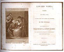 Lovers' Vows (1798), a play by Elizabeth Inchbald arguably best known now for having been featured in Jane Austen's novel Mansfield Park (1814), is one of at least four adaptations of August von Kotzebue's Das Kind der Liebe (1780; literally "Love Child," or "Natural Son," as it is often translated), all of which were published between 1798 and 1800. Inchbald's version is the only one to have been performed.[1] Dealing as it does with sex outside marriage and illegitimate birth, Inchbald in the Preface to the published version declares herself to have been highly sensitive to the task of adapting the original German text for "an English audience." Even so, she left the setting as Germany.