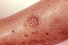 - ^ Diseases that may cause symptoms similar to loxoscelism include: streptococcal or staphylococcal infection (particularly by methicillin-resistant Staphylococcus aureus), herpes simplex, herpes zoster, diabetic ulcer, fungal infection, pyoderma gangrenosum, lymphomatoid papulosis, chemical burn, Toxicodendron dermatitis, squamous cell carcinoma, neoplasia, localized vasculitis, syphilis, Stevens-Johnson syndrome, toxic epidermal necrolysis, erythema nodosum, erythema multiforme, gonococcemia, purpura fulminans, sporotrichosis, Lyme disease, cowpox, and anthrax.[1]