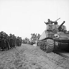 The 9th Battalion was also raised in 1940, serving alongside the 7th and 8th battalions in 215th Independent Infantry Brigade (Home). In 1941, the battalion was transferred to the Royal Armoured Corps and converted into the 148th Regiment Royal Armoured Corps. However, they continued to wear their Loyal Regiment cap badge on the black beret of the Royal Armoured Corps, as did all infantry units converted in such a way.[33] The regiment joined 33rd Armoured Brigade (previously 33rd Tank Brigade) and landed on the beaches of Normandy on 13 June 1944. The regiment fought throughout the Battle for Caen until it was disbanded, due to an acute shortage of manpower, on 16 August 1944, and replaced in the brigade by the 1st East Riding Yeomanry.[27][28][34][35]