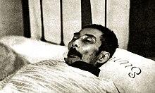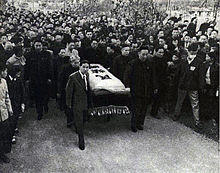 At 3:30 am on the morning of 18 October, the author woke with great difficulty breathing. Dr. Sudo, his physician, was summoned, and Lu Xun took injections to relieve the pain. His wife was with him throughout that night, but Lu Xun was found without a pulse at 5:11 am the next morning, 19 October.[27] Lu's remains were interred in a mausoleum within Lu Xun Park in Shanghai. Mao Zedong later made the calligraphic inscription above his tomb. He was survived by his son, Zhou Haiying. He was posthumously made a member of the Communist Party for his contributions to the May Fourth Movement.