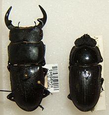 Female stag beetles are usually smaller than the males, with smaller mandibles that are much more powerful than the males'.[3] As larvae, females are distinguished by their cream-coloured, fat ovaries visible through the skin around two-thirds of the way down their back.