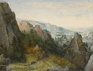 In their mixture of fantasy and accurate topographical details, van Valckenborch's landscape paintings offer a view of the world and man's relationship to it. This is particularly clear in his rocky landscapes in which the diminutive people on the winding path are reduced by the monumental cliffs. An example is the Rocky Landscape with Travelers on a Path (c. 1570, Sotheby's 6 July 2016, London lot 3) where the distant goatherd and the silhouettes of his charges seem ant-like in comparison to the vast distance, and the vertiginous perspective of the scene. This dramatic visual depiction is clearly intended as a commentary on man's place within the universe.[7]